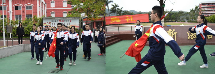 莊嚴的前奏響起,我校國旗護衛(wèi)隊邁著鏗鏘有力的步伐走向升旗臺。