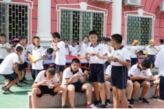◥德育處何漢標(biāo)副主任結(jié)合我校文明班評(píng)比標(biāo)準(zhǔn),組織學(xué)習(xí)《中學(xué)生守則》、《中小學(xué)生日常行為規(guī)范》。