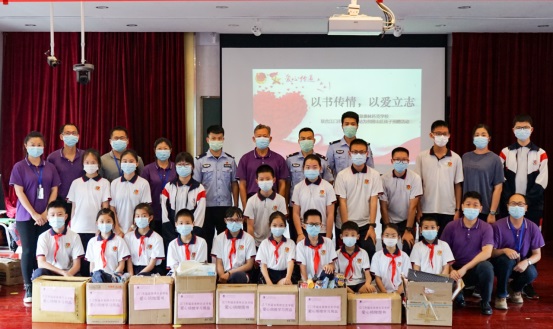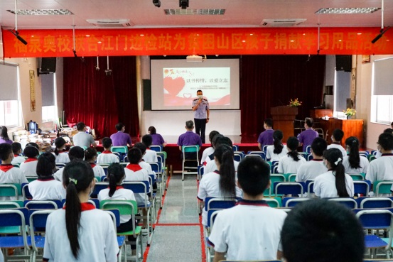 5月25日下午四樓階梯室愛心暖暖,其樂融融,一場為貧困山區(qū)孩子捐贈學習用品活動正在進行。本次活動由我校與江門出入境邊防檢查站共同舉辦,以捐書助學的形式開展。江門出入境邊防檢查站政治處羅超副主任、軍官代表、羅金宏校長等學校行政領(lǐng)導以及各班學生代表參加了本次捐贈儀式。