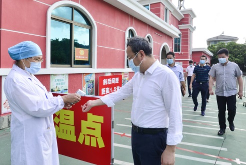 在校門口,劉市長(zhǎng)一行在接受體溫監(jiān)測(cè)、進(jìn)行消毒洗手后進(jìn)入校園。