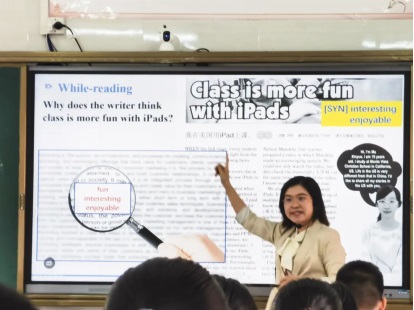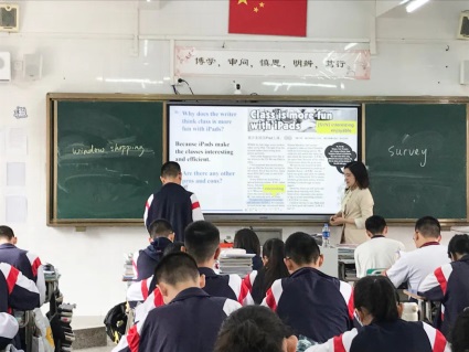首先,胡曉君老師以熱點(diǎn)話題閱讀作引入,教授學(xué)生skimming (略讀) 和scanning (細(xì)讀) 兩大重要閱讀技巧;接著提出問(wèn)題“What are the pros and cons of using iPads in class?”引導(dǎo)學(xué)生從不同角度去思考,拓展學(xué)生的思維能力。在寫(xiě)作拓展部分,胡老師以“OREO餅干”作有趣引導(dǎo),教授學(xué)生Opinion Writing ( 即Opinion-Reasons-Example-Opinion ),隨后讓同學(xué)們當(dāng)堂寫(xiě)作,小組互評(píng)并推選最優(yōu)作品進(jìn)行分享。在最后的英語(yǔ)新題型訓(xùn)練環(huán)節(jié),胡老師指出,近年華附的英語(yǔ)奧考,除了考查學(xué)生的英語(yǔ)運(yùn)用能力,還突顯考查學(xué)生的英語(yǔ)思維品質(zhì),重視學(xué)生的英語(yǔ)核心素養(yǎng)。因此,她鼓勵(lì)同學(xué)們平時(shí)要多閱讀、多積累,培養(yǎng)良好的英語(yǔ)素養(yǎng)。