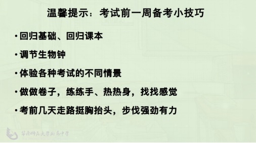 情景三是走出“心理高原期”。林老師建議同學(xué)們不要過多關(guān)注成績,淡化結(jié)果,應(yīng)從考試中找到自己可以提升的點,聚焦當下,注重過程的提高。林老師還貼心提供了考試前一周備考小技巧給同學(xué)們。