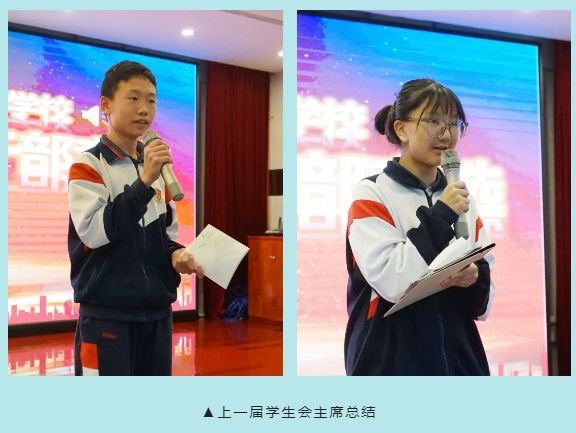 上一屆學生會主席黃楚雄和岳家盈分別分享了一年工作的收獲,表達了自己在學生會管理中學到了很多課本以外的知識,感受到了這個大家庭的溫暖,并對下一屆學生會提出一些工作的建議和表達美好的祝愿。