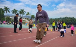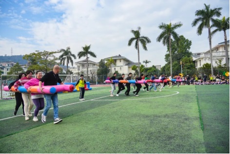 各年級(jí)的家長代表組成了一支隊(duì)伍,在一聲聲吶喊與歡呼中拼盡全力向著終點(diǎn)沖刺。