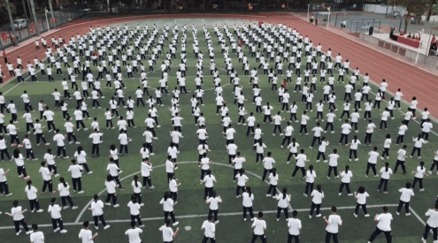 看!同學(xué)們動(dòng)作標(biāo)準(zhǔn)、有力、優(yōu)美,張弛有度,充盈著剛健之美;他們的舉手、抬腳、彎腰、轉(zhuǎn)身、跳躍整齊統(tǒng)一。大家全神貫注地投入比賽,盡可能地將每一個(gè)動(dòng)作做到完美。