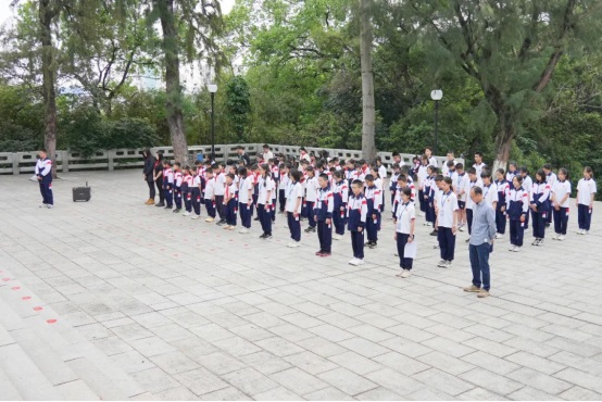 活動在莊嚴的國歌聲中開始,全體師生列隊整齊,神情莊重地注視著紀念碑。