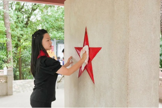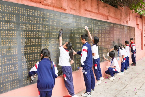 活動結束后,師生有序觀看紀念碑上先烈的英雄事跡,深入了解這塊土地上發(fā)生過的一段又一段可歌可泣的英雄故事,還用清潔用具,為“英雄們”擦灰去塵。