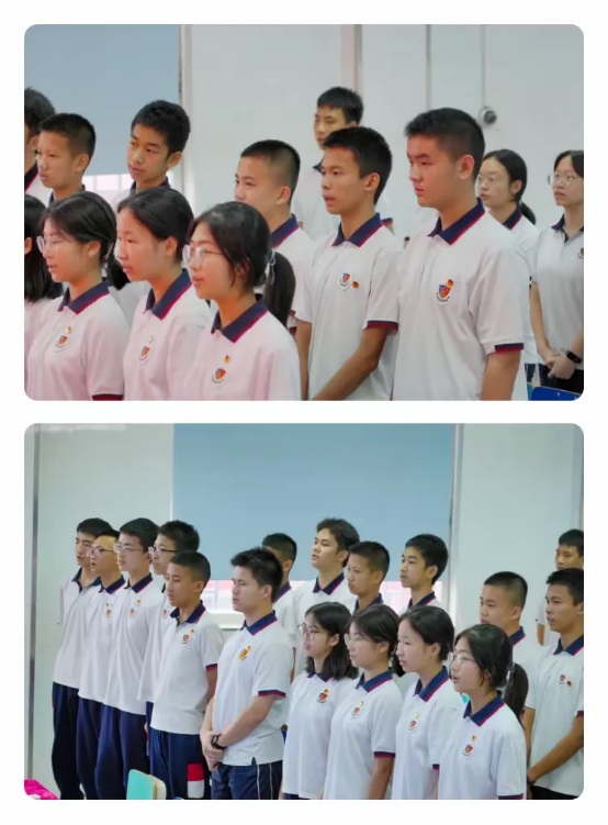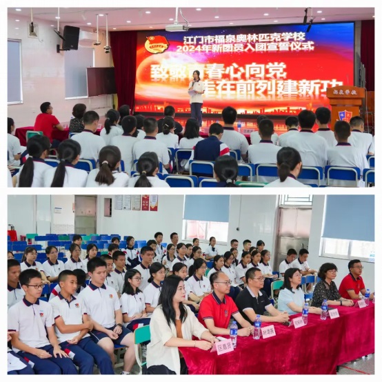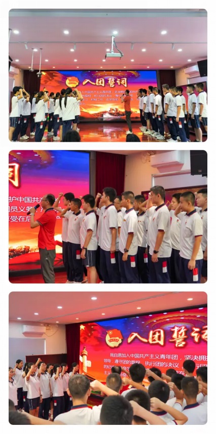 學校領導們?yōu)樾聢F員頒發(fā)并佩戴團徽。這一刻,永遠跟黨走的信念將永不褪色,相信同學們能嚴守紀律,勤奮學習,起模范帶頭作用,為社會主義事業(yè)和自己的人生譜寫更加絢麗的華章。