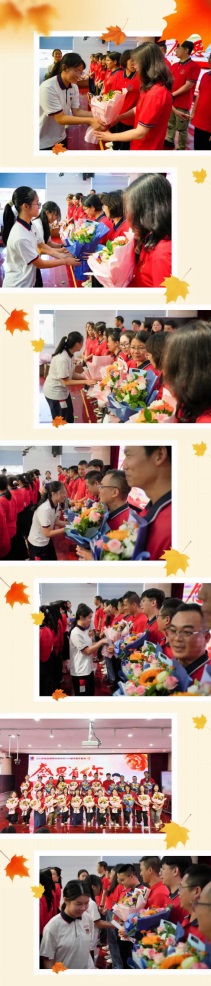 學(xué)生代表將滿載心意的鮮花送到學(xué)校領(lǐng)導(dǎo)、家長(zhǎng)代表和老師手中,并敬禮,表達(dá)全體學(xué)生的感恩之情。
