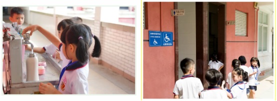 課間,孩子們學(xué)會倒水和有序上廁所。