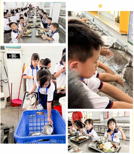 午餐時間,在生活老師帶領(lǐng)下,孩子們來到食堂,熟悉用餐區(qū)域和自己的專屬座位,以及文明用餐的規(guī)則,他們很快學(xué)會了如何有序地取餐、保持餐桌的整潔和回收餐具。