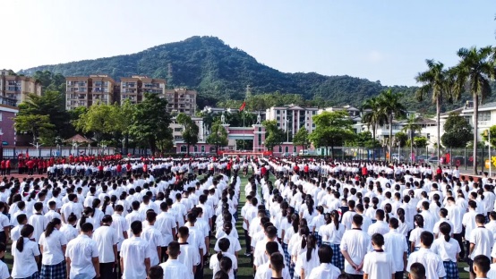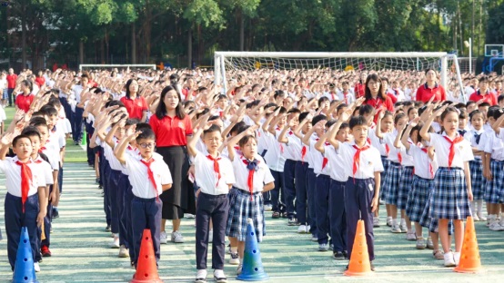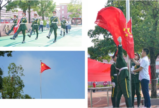 8點(diǎn)10分,全體師生齊聚足球場(chǎng)。在一片莊重肅穆的氣氛中,國(guó)旗護(hù)衛(wèi)隊(duì)步伐堅(jiān)定、整齊劃一,護(hù)送著國(guó)旗緩緩走向升旗臺(tái)。隨著國(guó)歌的雄壯旋律,五星紅旗緩緩升起,全體師生肅立致敬,齊聲高唱國(guó)歌。