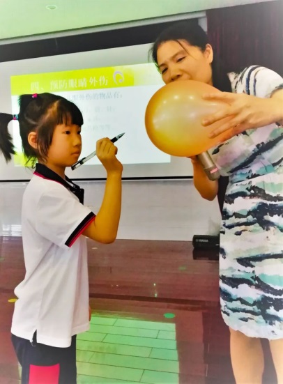 最吸引孩子的就是“實(shí)驗(yàn)環(huán)節(jié)”了,將氣球比作眼球,看看哪些物品會(huì)對眼睛造成傷害?