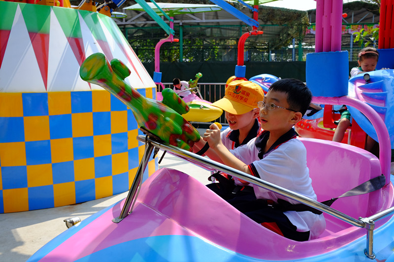 小學(xué)部自行選擇了參觀高明盈香生態(tài)園,這里以生態(tài)為主,學(xué)生參觀了向日癸種植基地,玩了適合他們的機動游戲等;中學(xué)部選擇了深圳歡樂谷,這里有更多的機動游戲,蘊含了東西方的文化。同學(xué)們不但玩了很多自己喜歡的機動游戲,還領(lǐng)略了豐富多彩的異國風情。在活動中,同學(xué)們還時刻遵循一切行動以班級為單位的原則,做到在活動中互幫互助,充分體現(xiàn)了同學(xué)們團結(jié)互助的精神。