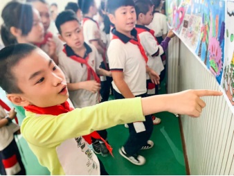 課間,各班組織有序參觀。一幅幅形象生動、主題鮮明的作品喚起了同學們保護地球、關愛家園的意識。