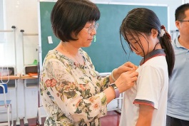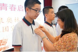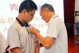 學(xué)校領(lǐng)導(dǎo)為新團(tuán)員佩戴團(tuán)徽。鮮紅的團(tuán)徽佩戴在左胸前,這代表共青團(tuán)肩負(fù)重任,責(zé)任應(yīng)在心間銘記!