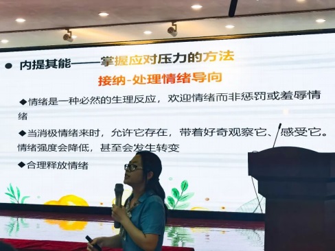 在同學(xué)們目前的壓力現(xiàn)狀有了初步了解后,林佩珠老師以生動(dòng)的事例、科學(xué)的知識(shí)讓同學(xué)們明白“適當(dāng)?shù)膲毫?huì)使人進(jìn)步”。